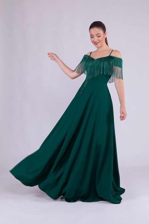 Женское макси-платье с лодочным вырезом и кистями изумрудного цвета, материал: хлопок-полиэстер-эластан, 11 цветовых вариантов, скрытая молния на спине