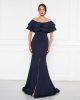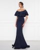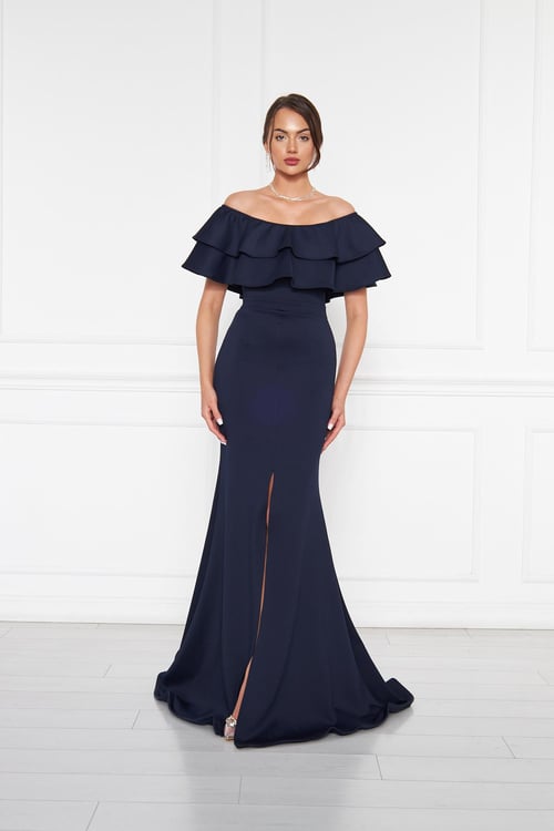 Женское макси-платье с вырезом Кармен, низким плечом и разрезом из эластичной ткани, цвет: тёмно-синий, размер 34-54