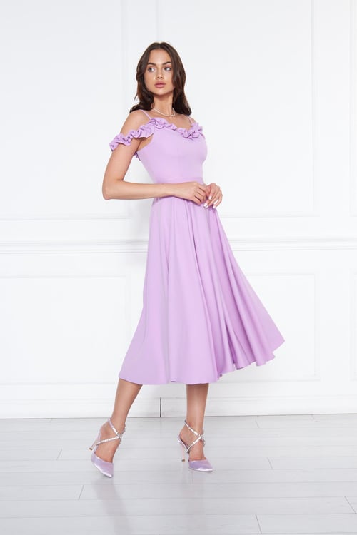 Женское платье миди с регулируемыми бретелями и рюшами, ткань с складками, цвет лиловый, размеры от 34 до 54