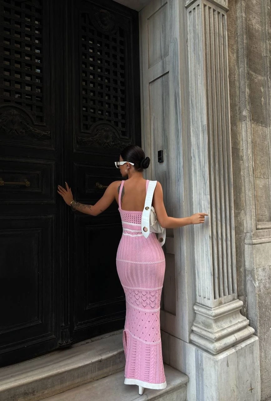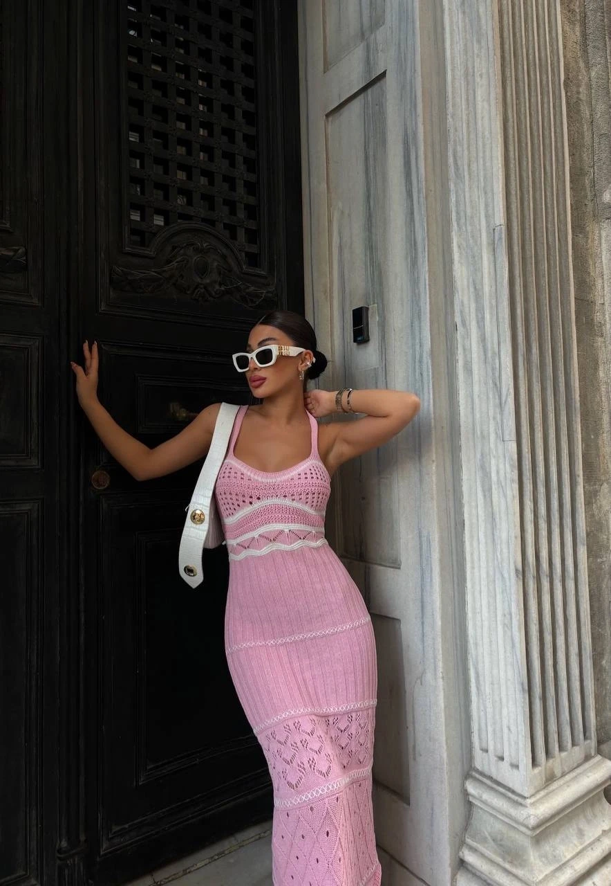 Женское розовое трикотажное платье с разрезами и ажурной отделкой, длинный летний фасон, стандартный размер