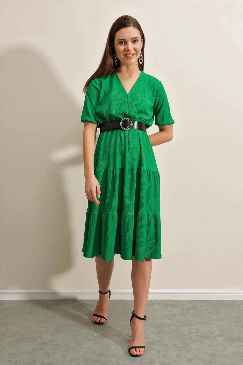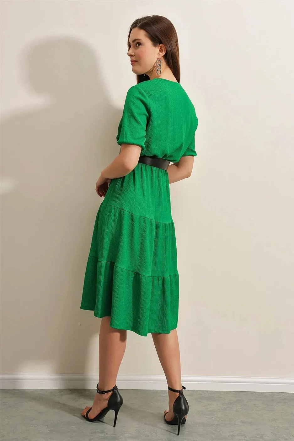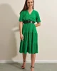 Женское зеленое платье с V-образным вырезом, на резинке, с черным поясом и трикотажем